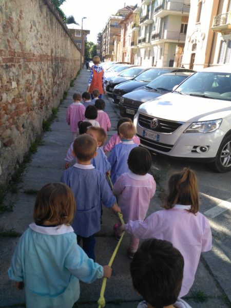 Finalmente con l’arrivo del bel tempo e del caldo i bambini di due anni hanno incominciato a uscire in cordata per passeggiare o andare al parco giochi! I bambini hanno accolto questa novità con entusiasmo e soprattutto con grande rispetto delle regole! Grazie a queste uscite i bambini imparano già da piccolini l’educazione stradale e come ci si comporta in città.