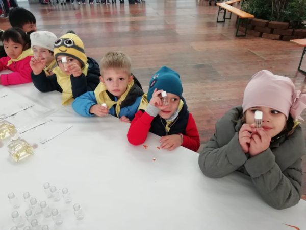 Venerdì 18 ottobre, in mattinata, ci siamo recati alla fiera del marrone con i bambini di 4 e 5 anni, divisi in due gruppi. Un gruppo ha annusato fragranze diverse e poi ne ha scelte tre per comporre un profumo. Dopo hanno osservato come si coltiva l’orto e hanno trapiantato l’insalata.