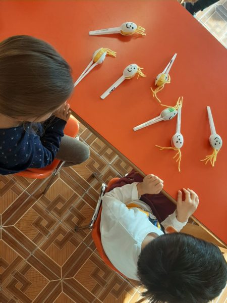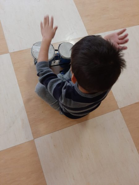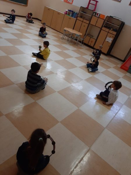 Dopo aver inventato piccoli strumenti musicali, scendiamo in salone e suoniamo coordinati dall’insegnante.